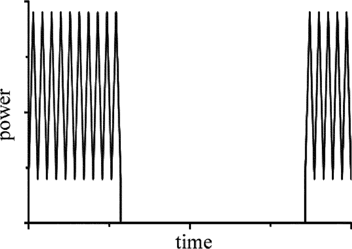納秒脈沖的輸出由毫秒激光的脈沖有效信號控制,用以實現兩束激光脈沖的同步,當毫秒脈沖寬度激光脈沖輸出時納秒脈沖激光啟動輸出,當毫秒激光停止輸出時停止納秒脈沖激光的輸出,兩束激光脈沖啟動時間的延遲為微秒量級。改變毫秒激光的脈沖寬度,能夠控制一個毫秒脈沖寬度內復合的納秒脈沖個數。兩束激光峰值功率疊加如圖 2所示。