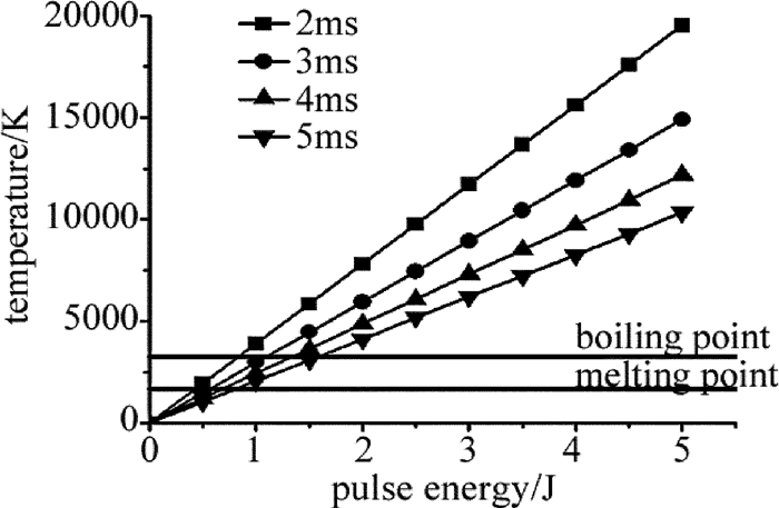 由(1)式得到不同脈寬下毫秒激光單脈沖能量與不銹鋼材料表面溫升的關系曲線,如圖 6所示。根據計算可知,使不銹鋼表面達到熔點所需的激光能量約為其達到沸點的一半。以脈寬為5ms的長脈沖為例,使不銹鋼表面達到熔點的單脈沖能量為0.82J,達到沸點的單脈沖能量為1.58J。當脈沖能量相同時,脈寬越窄,峰值功率密度越大,材料的表面溫升越高。納秒脈沖的峰值功率密度遠大于毫秒脈沖,疊加后使材料表面溫度進一步升高。
